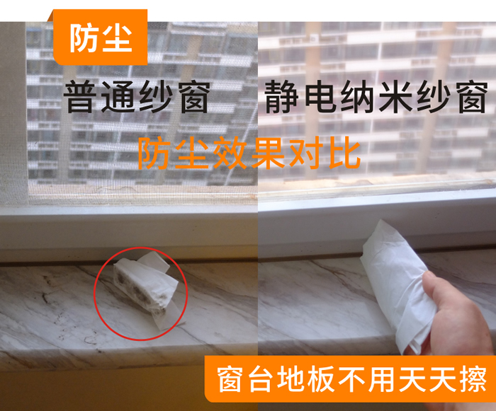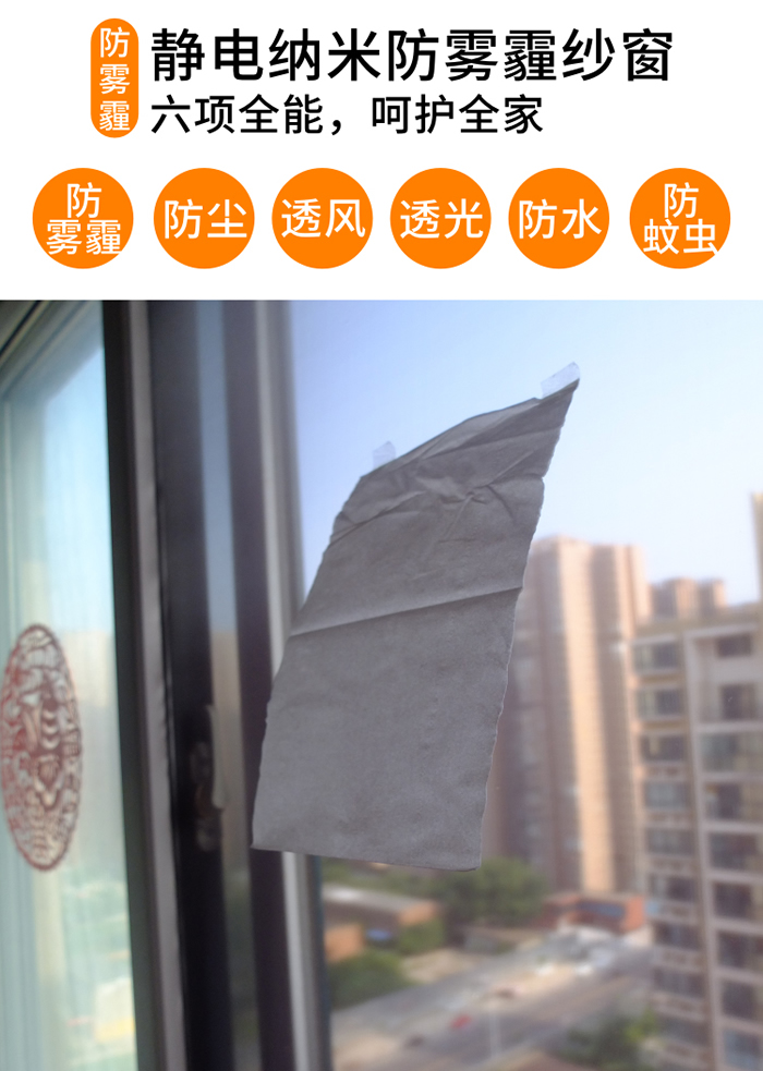 納米防霧霾紗窗具有防塵防霧霾透風(fēng)防水防蚊蟲等優(yōu)勢,對(duì)于夏季開窗通風(fēng)的用戶來說,是比較理想的窗紗網(wǎng),特別適合城市居民。普通紗窗防塵效果比防霧霾紗窗的防塵效果差很多