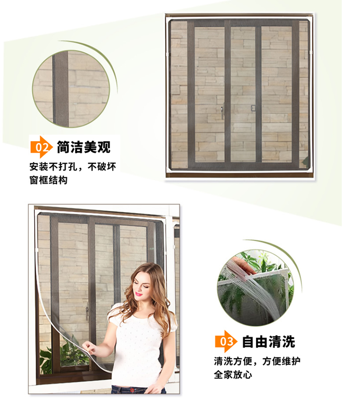 防霧霾紗窗磁性防霧霾紗窗不破壞窗框,直接粘貼到窗框上磁性防霧霾紗窗不破壞窗框,直接將窗紗粘貼到窗框上磁性防霧霾紗窗是單面背膠磁條與紗窗磁條對(duì)吸磁性防霧霾紗窗是單面背膠磁條與紗窗磁條對(duì)吸,可以反復(fù)拉開和吸附。磁性防霧霾紗窗框顏色有四種可選磁性防霧霾紗窗框顏色有四種可選,白色、灰色、綠色、咖啡色。