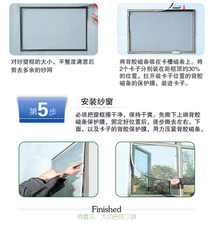 防霧霾紗窗防霧霾紗窗安裝步驟防霧霾紗窗安裝步驟,如上圖所示,首先需要量尺做框,然后壓紗,剪紗網(wǎng)。防霧霾紗窗制作好之后減去多余的窗紗網(wǎng)防霧霾紗窗制作好之后減去多余的窗紗網(wǎng),到這一步紗窗基本就安裝完成了。