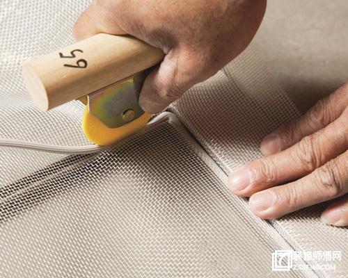 七、用壓輪將壓條壓入壓槽,這個(gè)過(guò)程需要注意紗網(wǎng)保持平整,保持紗網(wǎng)和窗框的角度不要發(fā)生傾斜。
