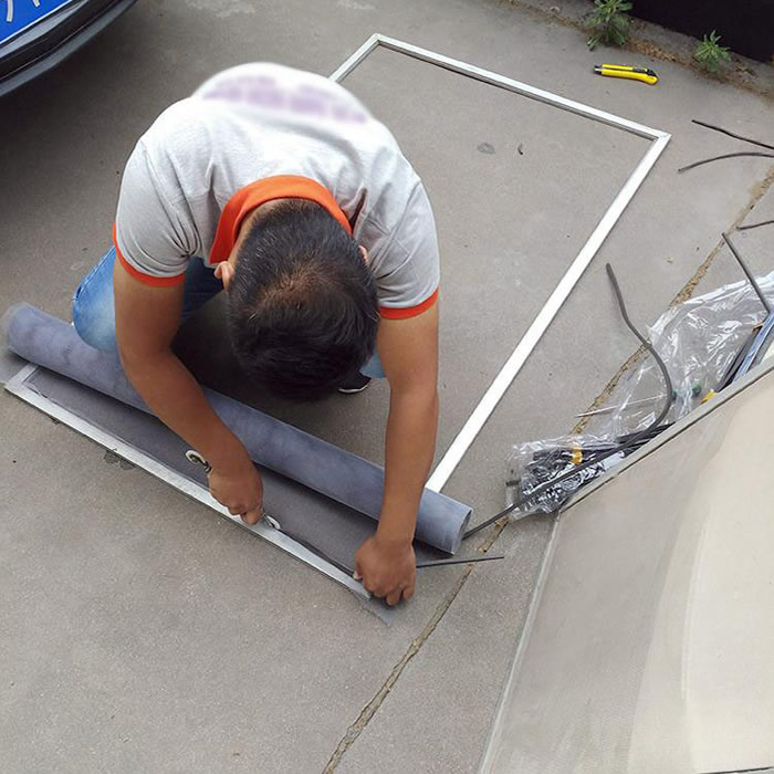 7、在穩(wěn)固第三、四邊時(shí),需要一邊把紗網(wǎng)進(jìn)行拉緊,另一邊把壓條進(jìn)行壓入,之后把有剩的壓條剪掉。